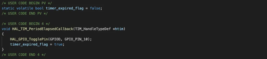 In the callback function, we simply use HAL GPIO function to toggle GPIO D10 and set a flag to true to indicate that interrupt has happened.