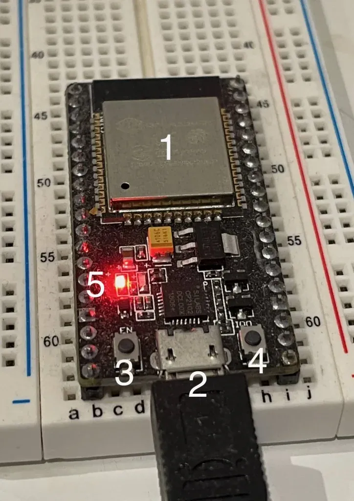 - (2) Micro USB Port to provide 5V power and exchange data from a computer. The module integrates an USB-to-UART bridge chip CP2102N that allow data communication from ESP32 and a host computer via UART. Firmware can be uploaded to ESP32 via this serial interface. During development, logging messages can also be printed to a terminal console via this path.