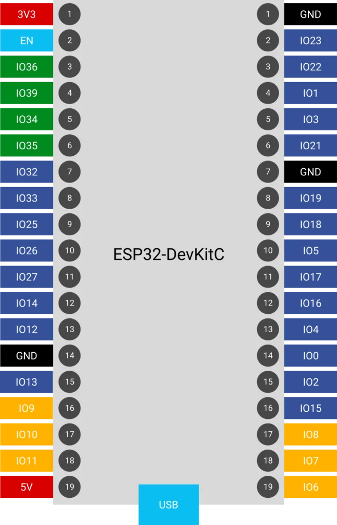 | IO6, 7, 8, 9, 10, 11 (marked with yellow color) | These pins are connected to external SPI flash of the module. Avoid using these pins in your application as they may cause conflict with accessing flash memory |