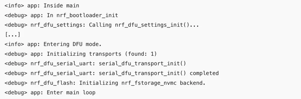 From these debug messages, you can infer how the bootloader works and you can trace back to each of the functions in the source code. For instance, you can see that on startup, it calls nrf_bootloader_init() and will check bootloader settings parameters to see if there is an application that needs to be activated, then check if there is a valid app to boot. If it detects no valid application, it will stay in bootloader mode waiting for a new application image.