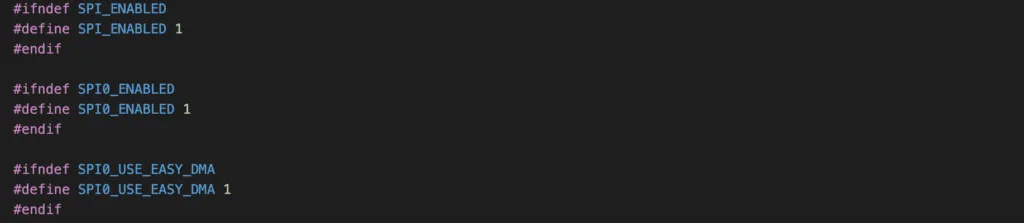 spiby using theNRF_DRV_SPI_INSTANCEmacro. In this example, they are using SPIM0 instance with EasyDMA enabled. As mentioned earlier, you will find EasyDMA is used no where in the main program. It is enabled through project configuration sdk_config.h and used internally inside driver functions.