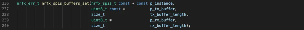 In this section, we will analyse the SPIS project example in nRF5 SDK version 17.1. Since it’s simple enough, I won’t provide another example project in this article. Open main.c from folder nRF5_SDK_17.1.0_ddde560/examples/peripheral/spis and inspect the code in there. As you can see, in this example: