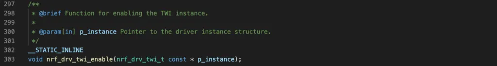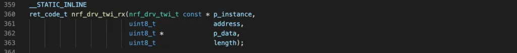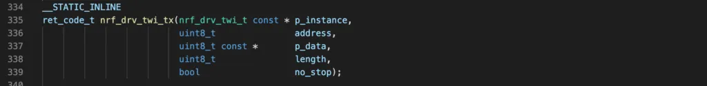 p_instanceis a pointer to an instance structure. You can use the macroNRF_DRV_TWI_INSTANCE()with an instance index to define your instance.p_configis the address of a configuration structure which tells which pins are used as SCL and SDA, what is the I2C frequency (100 kHz, 250 kHz or 400 kHz)event_handleris a callback function that executes when a TWI event happens. An event could be:NRF_DRV_TWI_EVT_DONE: indicates a transaction is completedNRF_DRV_TWI_EVT_ADDRESS_NACK: this event is fired if NACK is received after sending the address, which means something is wrong with the slave address.NRF_DRV_TWI_EVT_DATA_NACK: an error event indicating NACK is received after sending a data byte. This could be due to the slave device is busy with other tasks and not responding.