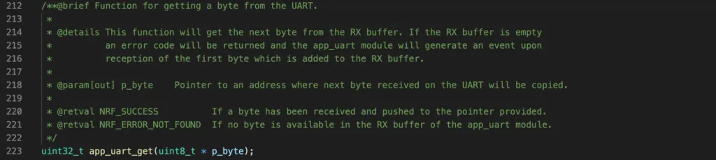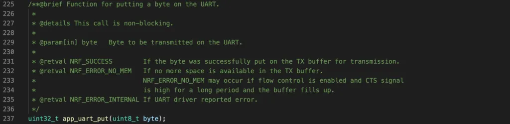 P_COMM_PARAMS: is a pointer that points to UART communication structure of typeapp_uart_comm_params_t. This structure contains information about which pins are used for UART communication, whether to use flow control and parity, and at what speed (in baud) it should use.RX_BUF_SIZEandTX_BUF_SIZE: specify the size of receiver and transmitter buffersEVT_HANDLER: a callback function to be invoked when an event happens in the UART module.IRQ_PRIO: specify tnterrupt priorityERR_CODE: the return code of the initialisation. If initialisation is successful, it will returnNRF_SUCCESS.