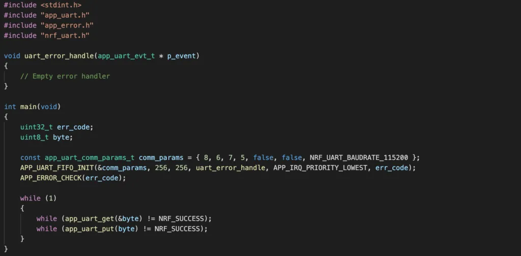 The UART and UARTE modules are controlled by nrfx_uart and nrfx_uarte drivers in nRF5 SDK, respectively. We will, however, not using these drivers directly. There’s library app_uart which simplifies our jobs when working with UART/UARTE. In the next section, I will show you how to use this library.