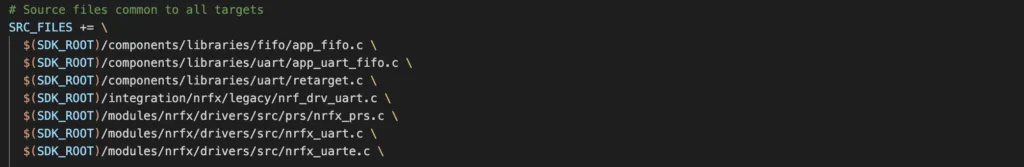 The first step is to include required source and header files in Makefile. There are a number of files that you need to include, as shown below. These are dependencies for app_uart module that we are going to use.