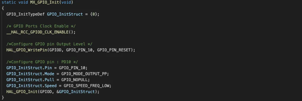 Let’s take a look at what functions are generated in main.c to initialise GPIO pin PD10.