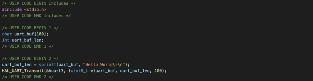 Now you are ready to send data over UART. For example, if you want to send a string “Hello World”, you would need to call the function HAL_UART_Transmit() as shown below