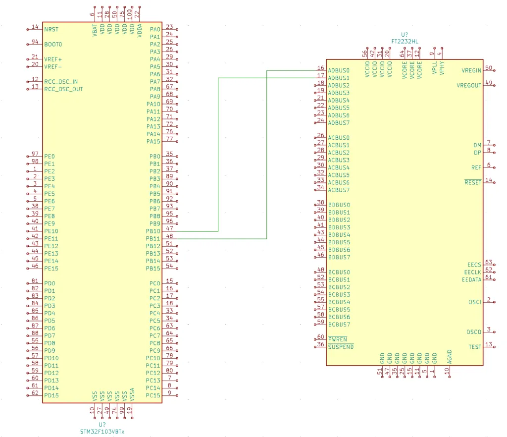 For the STM32 to communicate with the CJMCU-2232HL module, you need to connect TX pin of USART3 to RX pin of channel A of CJMCU-2232HL, and connect RX pin of USART3 to TX pin of channel A of CJMCU-2232HL as shown below