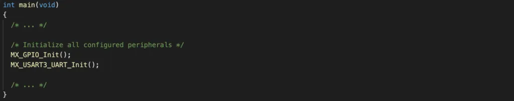 This function’s job is to configure the USART3 module using the HAL driver HAL_UART_Init() with the parameters we have specified in the previous step. It is invoked in main() during initialisation