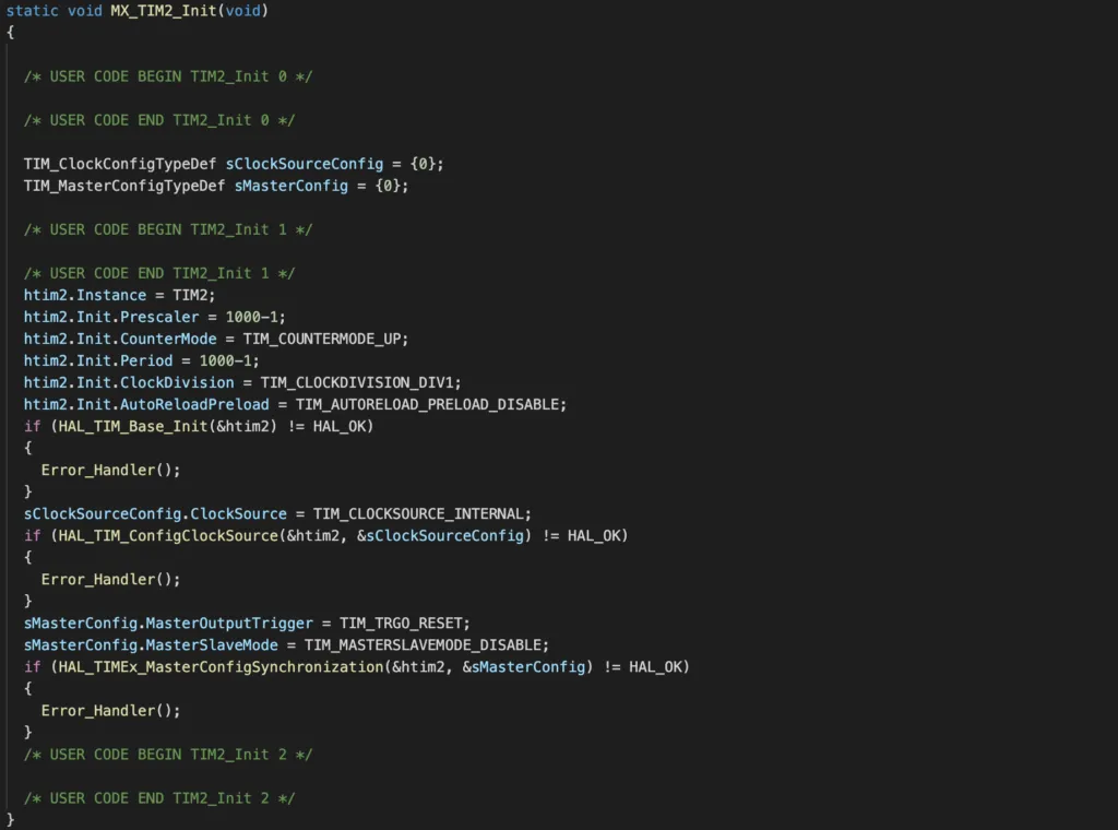 If you examine the main.c, you will see the following function MX_TIM2_Init() for initialising timer 2 with the configuration in the previous step. This function call HAL function HAL_TIM_Base_Init() and pass in a configuration structure to initialise timer 2.