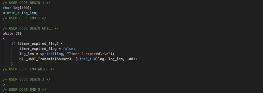 To print log when timer 2 expires, add the following code. It will check if timer 2 flag to see if timer 2 expires. If yes, it will print logs using USART3. It is a good practice to keep interrupt handler as short as possible and handle time-consuming tasks in the main loop. In this project, we toggle a flag in the timer callback and check for the flag in the main loop.
