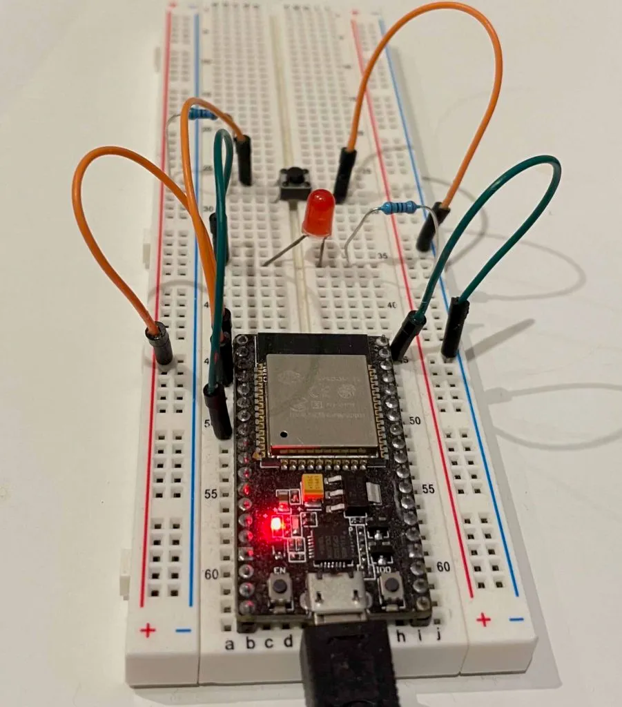 In this project, we will be using ESP32 DevKitC, a LED connected in series with a resistor, and a push button. If you are using other development kit, you will need to check which GPIO pins are used to connect to a LED and button.
