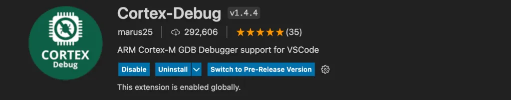 Installing the extension is trivial, as you just need to type ‘Cortex-Debug’ and click Install button. Here’s what you see after successfully installing the extension