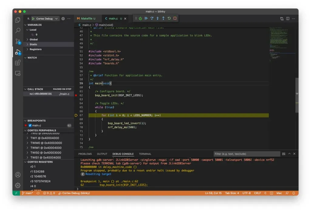 Debugging is essential when developing a firmware application, hence it is worth to spend some time to set it up properly. With the help of Cortex-Debug extension, you can make VSCode as a powerful nRF52 integrated development environment.