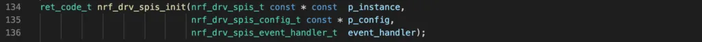 In this section, we will analyse the SPIS project example in nRF5 SDK version 17.1. Since it’s simple enough, I won’t provide another example project in this article. Open main.c from folder nRF5_SDK_17.1.0_ddde560/examples/peripheral/spis and inspect the code in there. As you can see, in this example:
