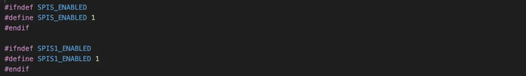 Next, you need to enable the SPIS instance you want to use in sdk_config.h. Supposed you want to use SPIS1 instance, you will need to enable the following settings. These settings are used internally by some source files and if you don’t enable them, you’ll get compiler’s complaint.