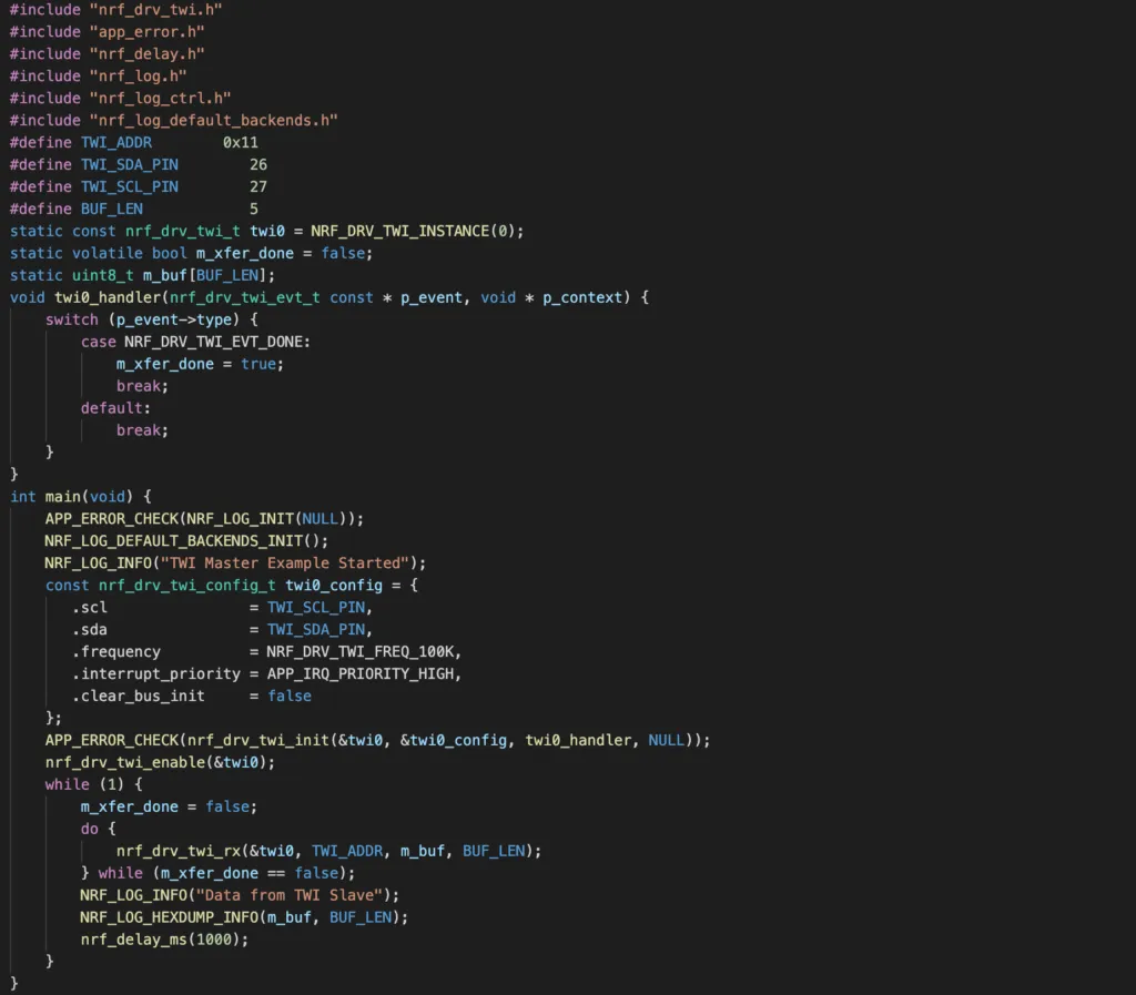 p_instanceis a pointer to an instance structure. You can use the macroNRF_DRV_TWI_INSTANCE()with an instance index to define your instance.p_configis the address of a configuration structure which tells which pins are used as SCL and SDA, what is the I2C frequency (100 kHz, 250 kHz or 400 kHz)event_handleris a callback function that executes when a TWI event happens. An event could be:NRF_DRV_TWI_EVT_DONE: indicates a transaction is completedNRF_DRV_TWI_EVT_ADDRESS_NACK: this event is fired if NACK is received after sending the address, which means something is wrong with the slave address.NRF_DRV_TWI_EVT_DATA_NACK: an error event indicating NACK is received after sending a data byte. This could be due to the slave device is busy with other tasks and not responding.