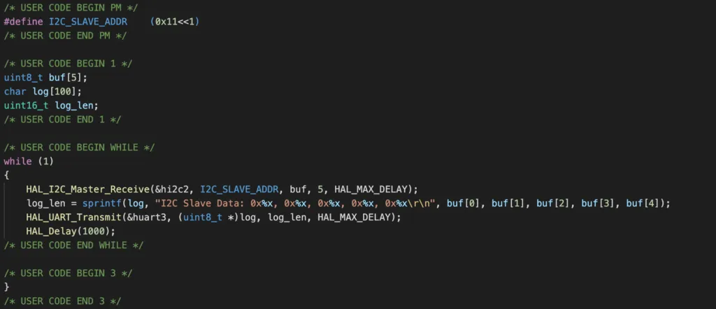 To read data from I2C slave device, add the following code to main.c