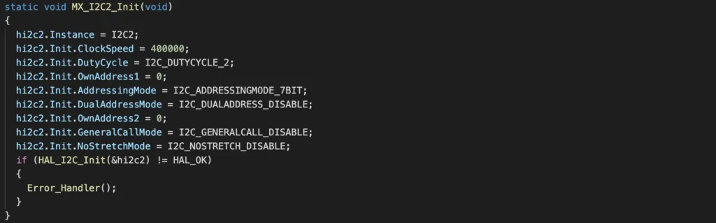 If you inspect main.c, you will see that the following function has been added automatically based on your selection. This function calls HAL_I2C_Init() with a configuration structure to initialise the I2C2.
